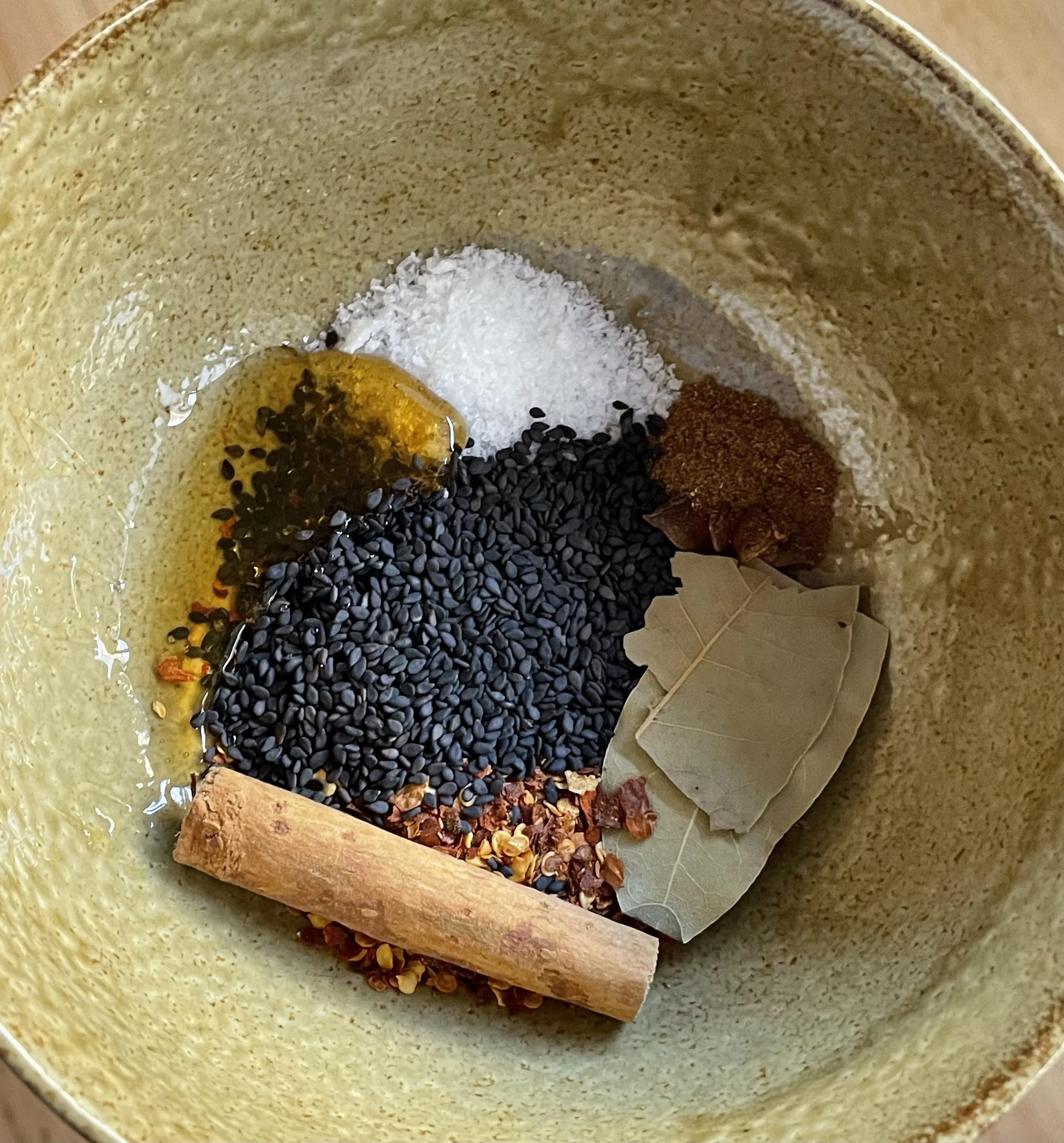 Into your heat proof jar or bowl, add the chilli flakes, sesame seeds, salt, honey, star anise, bay leaves, Chinese five spice and cinnamon sticks and set aside.